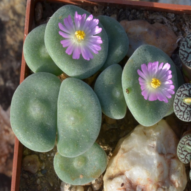 코노피툼은 남아프리카와 나미비아가 원산지로, 크기가 작고 둥근 잎이 짝을 이루는 것이 특징입니다. 돌처럼 보이는 외형과 함께 다양한 색상과 무늬를 가지고 있습니다. 가을에 꽃이 피며, 대부분 향기로운 꽃이 특징입니다.