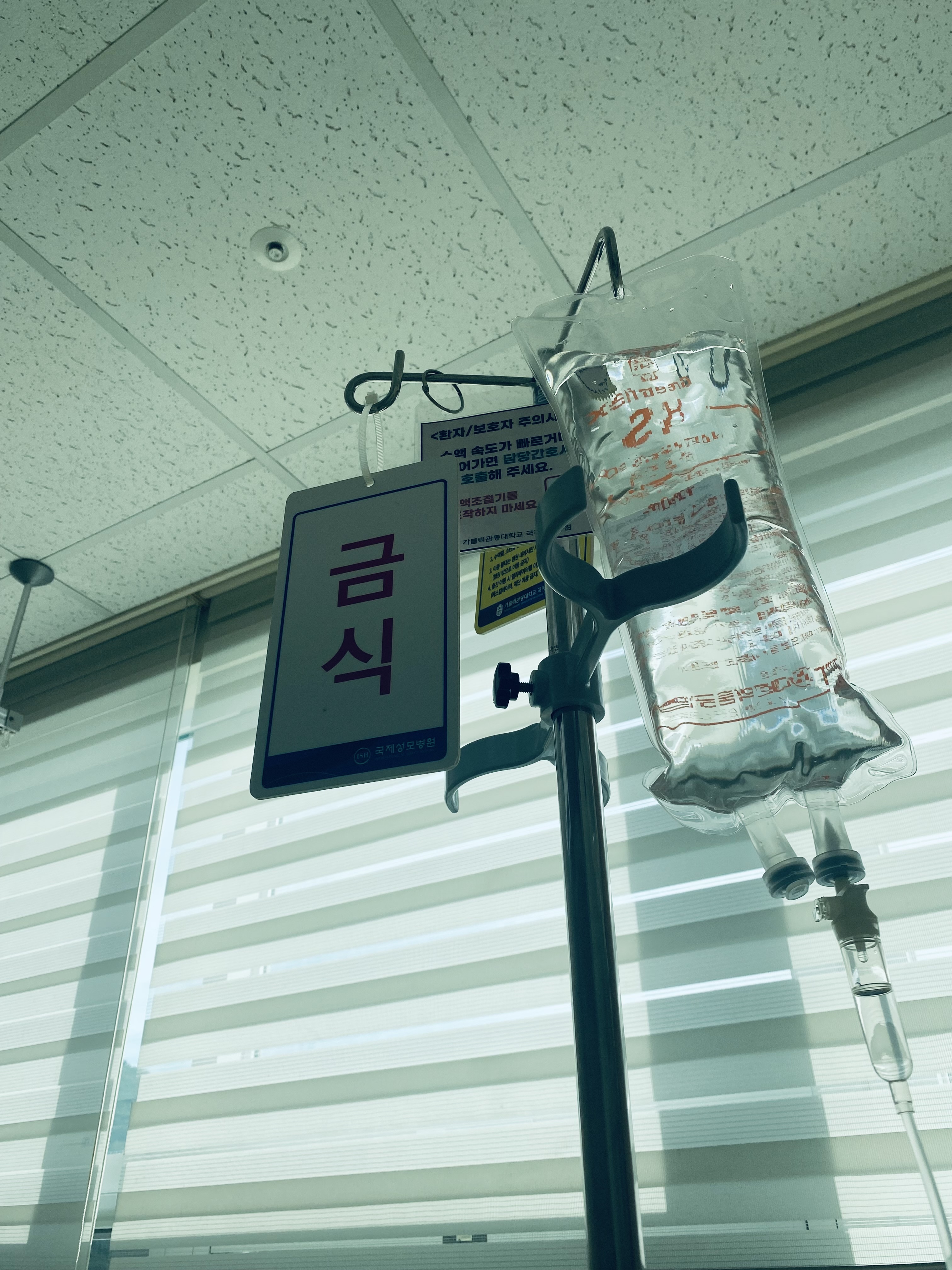 다시 병실로 돌아오면 이때부터 바쁘다. 수술용 바늘을 꽂고 항생제 검사도 하고 좀 있으면 수액도 달고 수술 전 주의사항도 안내받고 저녁도 신청해서 최후의 만찬을 먹고 시간이 후딱 지나간다. 저녁을 먹고 편의점에서 더 필요한 거 없나 둘러보기도 하고 핸드폰도 하고 빈둥빈둥 놀고 있으면 수술용 바늘 꽂아놓은 곳에 수액 연결해 주시고 금식딱지를 달아주신다.
